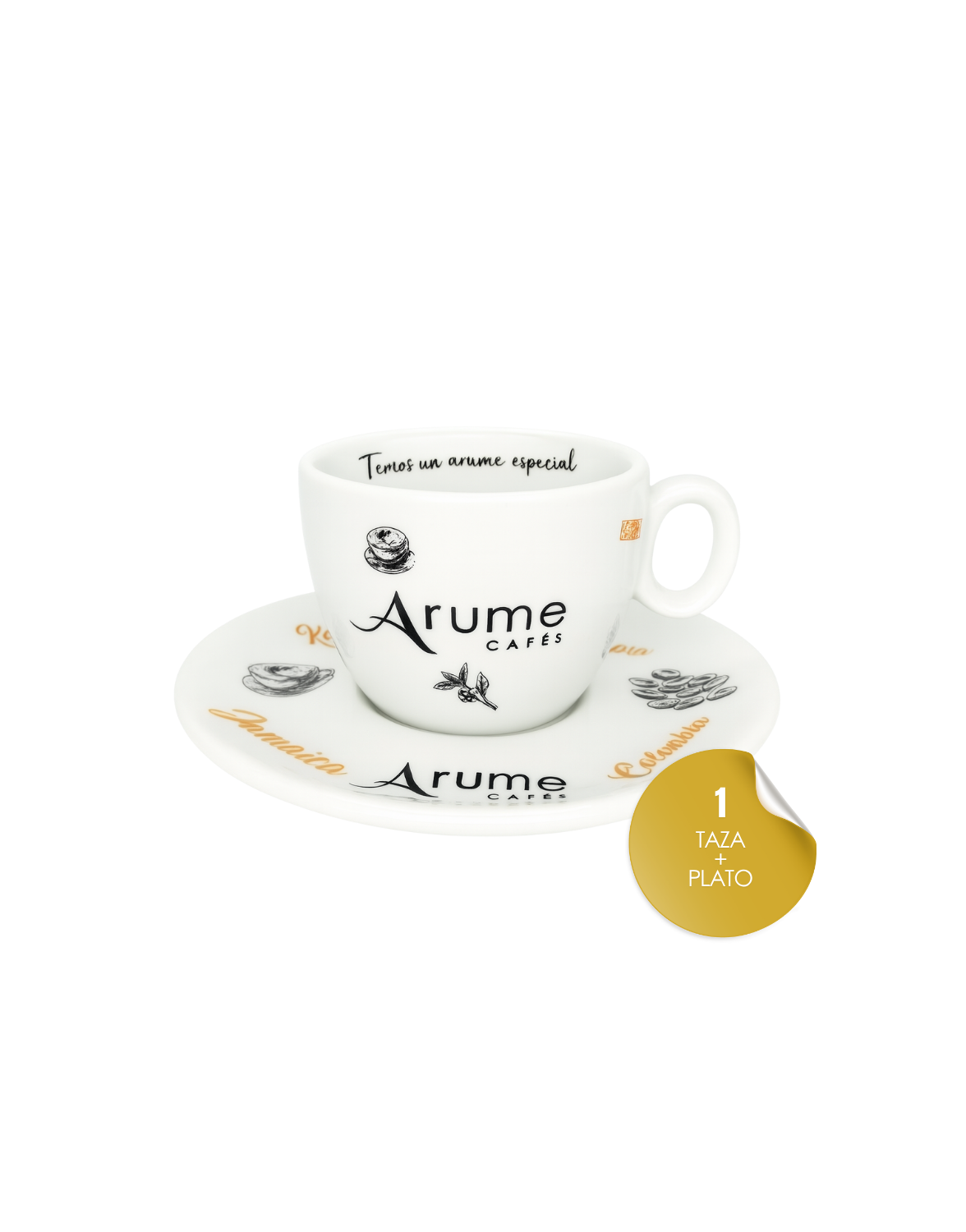 El diseño combina ilustraciones de granos y tazas con el logotipo Arume Cafés, logrando un estilo elegante y profesional. En el interior, el mensaje “Temos un arume especial” aporta un guiño exclusivo que convierte cada café en un momento especial.