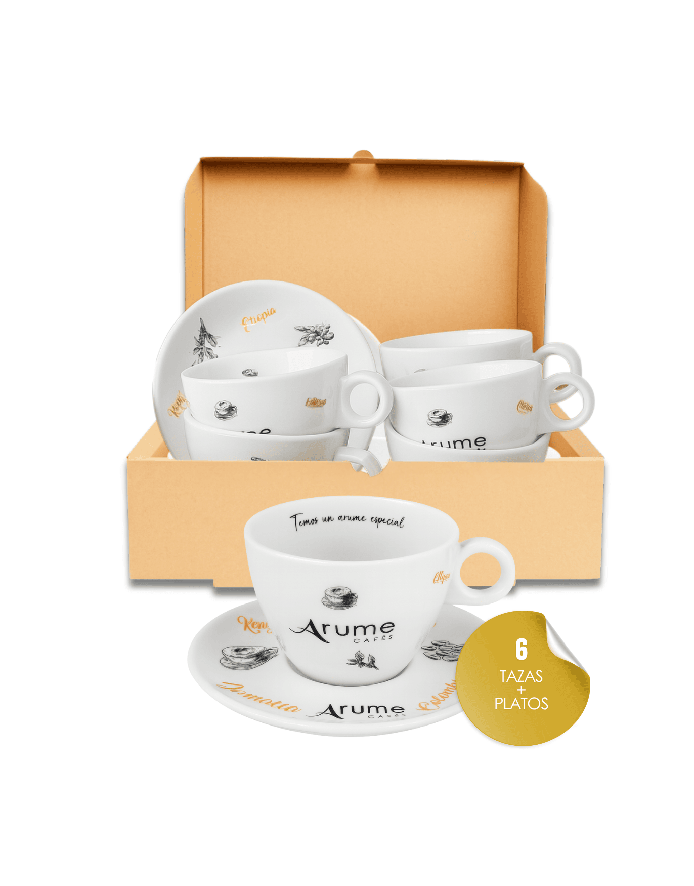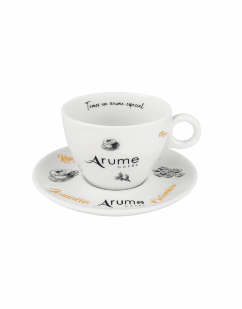 Con un diseño cuidado que mezcla ilustraciones cafeteras y el logotipo Arume Cafés, esta pieza transmite calidez y profesionalidad. El mensaje interior “Temos un arume especial” convierte cada sorbo en una experiencia única.